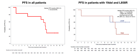 中位随访时间为15.6个月,ORR为16.7%(2/12; 95%CI:2.1%-48.4%),DCR为83.3%(10/12; 95% CI:51.6%-97.9%),中位PFS为11.0个月(95% CI: 9.6-NR),19del和L858R人群的中位PFS无统计学差异(11.2vs.NR月,HR=1.62, P=0.488)。