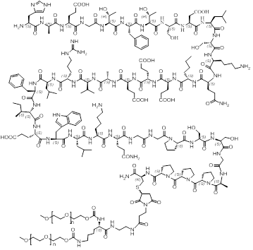 化学名称:组氨酰-D-丙氨酰-谷氨酰-甘氨酰-苏氨酰-苯丙氨酰-苏氨酰-丝氨酰-门冬氨酰-亮氨酰-丝氨酰-赖氨酰-谷氨酰氨酰-正亮氨酰-谷氨酰-谷氨酰-谷氨酰-丙氨酰-缬氨酰-精氨酰-亮氨酰-苯丙氨酰-异亮氨酰-谷氨酰-色氨酰-亮氨酰-赖氨酰-谷氨酰氨酰-甘氨酰-甘氨酰-脯氨酰-丝氨酰-丝氨酰-甘氨酰-丙氨酰-脯氨酰-脯氨酰-脯氨酰-硫-[(3RS)-1-{3-[(2-{Nα,Nε-二[ω-甲氧基聚(氧乙烯基)羰基]赖氨酰胺}-乙基)氨基]-3-氧丙基}-2,5-二氧吡咯烷-3-基]半胱氨酰胺。